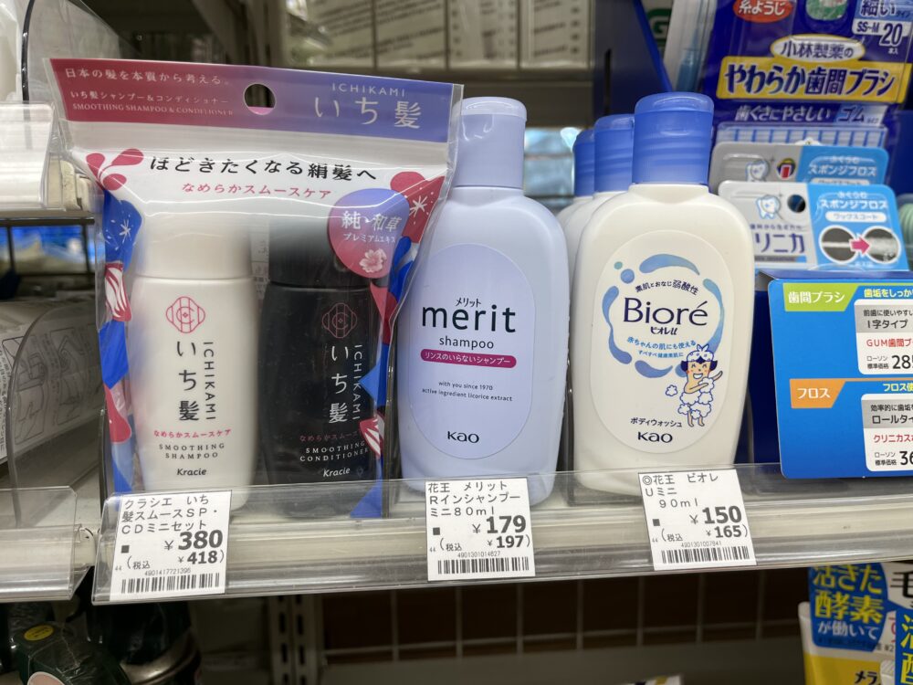どのコンビニもシャンプーやコンディショナーの小さいサイズは豊富にありましたが、ボディソープのミニサイズは意外と少なめ。その中でも「ビオレu」は3社すべてで共通して販売されており、最も入手しやすい定番アイテムでした。