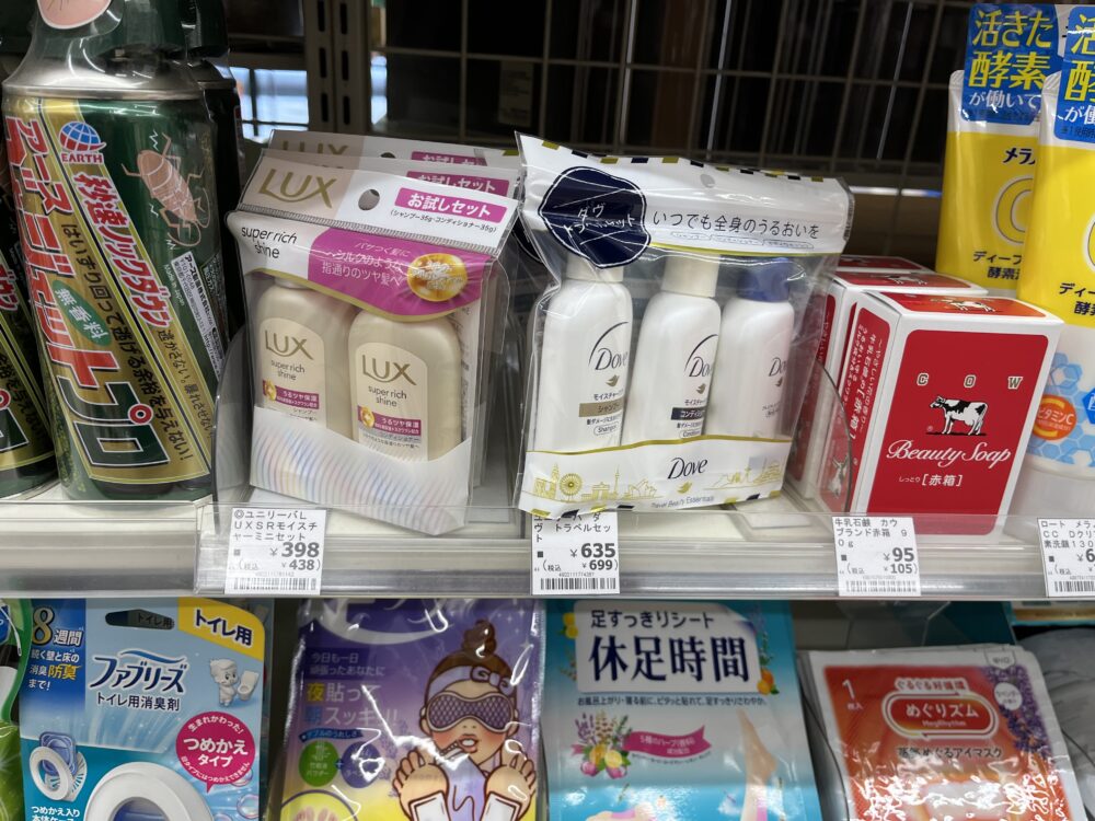 また、ダヴの「シャンプー・コンディショナー・ボディソープ」の3点トラベルセット(税抜635円・税込約700円)も販売されていました。旅行や出張でまとめて使いたい人に便利ですが、「ボディソープだけ欲しい」という場合は、単品のビオレuのほうが手軽でおすすめです。