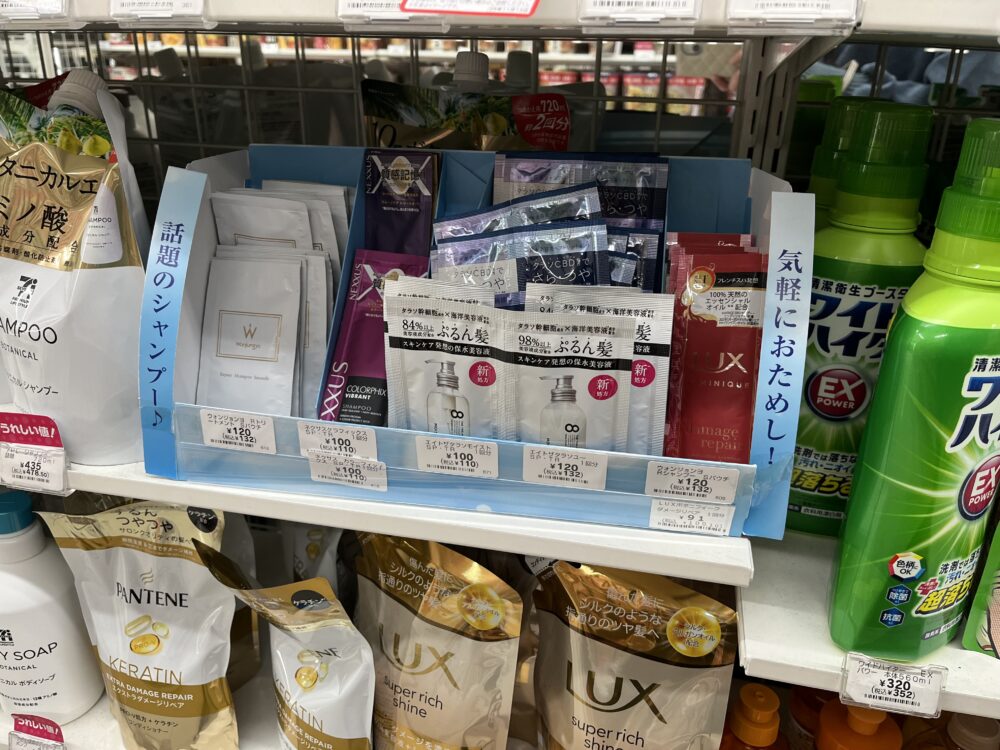 セブンイレブンでは、ラックスやパンテーンなどのシャンプー・コンディショナーのパウチタイプが豊富にそろっていました。一方で、小さいサイズのボディソープは「ビオレu」のみ。30ml前後のミニボトルで、税抜151円(税込166円前後)でした。
